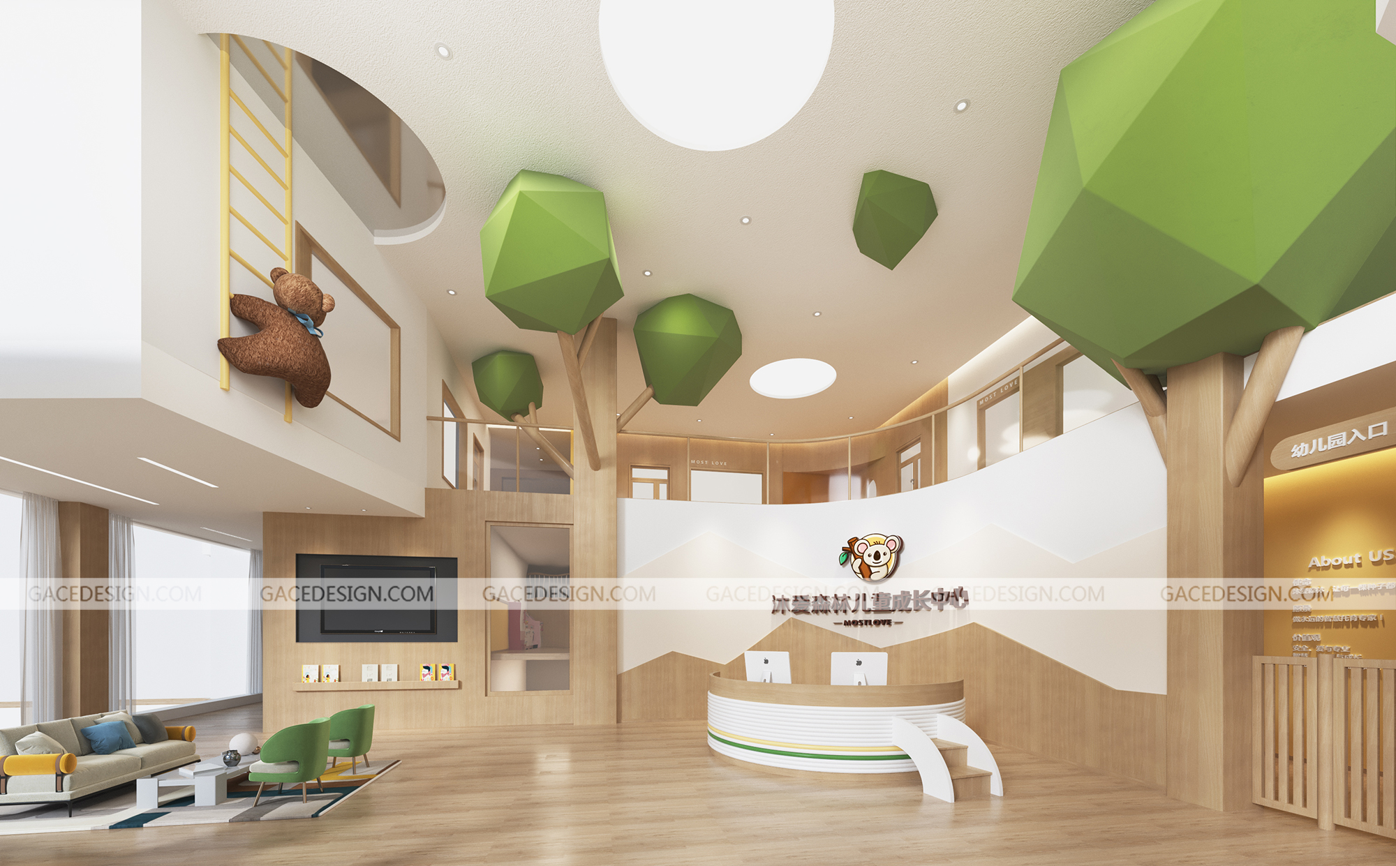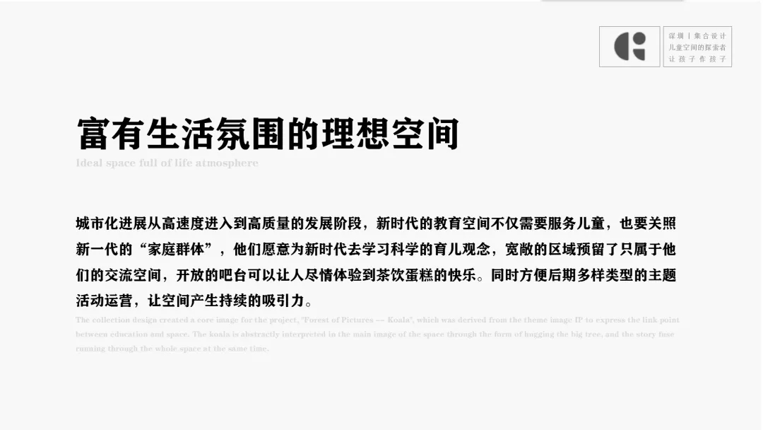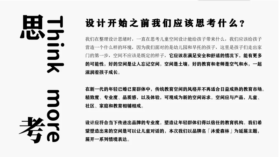 設(shè)計(jì)思考:在新一代的年輕群體中,傳統(tǒng)教育空間的風(fēng)格并不再適合日益成熟的教育市場。精致度、專業(yè)度、品質(zhì)感,以及體驗(yàn),可觀成為新的空間訴求。空間應(yīng)與產(chǎn)品,兒童、社區(qū)、家庭和教育相輔相成。設(shè)計(jì)應(yīng)符合當(dāng)下傳遞出品牌的專業(yè)度。塑造讓年輕群體們得以信任的教育機(jī)構(gòu)。我們希望塑造出來的空間是可以讓兒童對話的,本次我們以品牌名「沐愛森林」為延展主題,展開一系列情境表達(dá)。