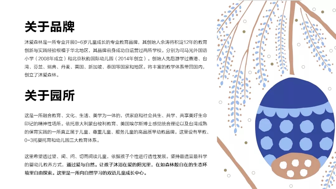 品牌背景:沐愛森林是一所專業(yè)開展0-6歲兒童成長的專業(yè)教育品牌,這是一所融合教育、文化、生活、美學(xué)為一體的,供家庭和社會共生、共學(xué)、共享美好生命印記的精神性場所。依托意大利蒙臺梭利教育、美國埃爾斯博士感覺統(tǒng)合理論以及臺灣成熟的保育實(shí)踐的高品質(zhì)06早幼教品牌。這里設(shè)有母嬰商店、早教、0-3托嬰托育和幼兒園三大教育體系。