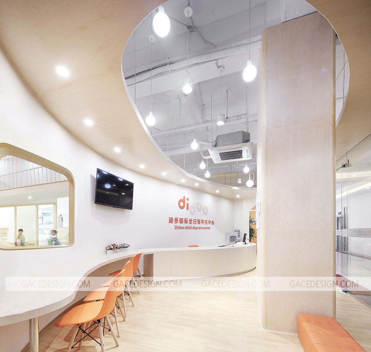迪多國(guó)際全日制早托中心,為新時(shí)代父母提供安全,科學(xué),全面的幼兒全日制托管服務(wù),致力于培養(yǎng)2-6歲兒童優(yōu)秀的行為習(xí)慣、獨(dú)立人格及社交能力。作為全日制日托中心,是兒童的另一個(gè)家,這是一個(gè)謀求大尺度變化的空間設(shè)計(jì),規(guī)避程式化的隔班教學(xué),將自然元素引入,打造全新的敘事空間。營(yíng)造簡(jiǎn)潔自由的空間,干凈的木色地板和青翠的草甸鋪陳開(kāi)來(lái),Didoo的橙色點(diǎn)綴其中,自然系配色去嘈雜化令空間更親和。