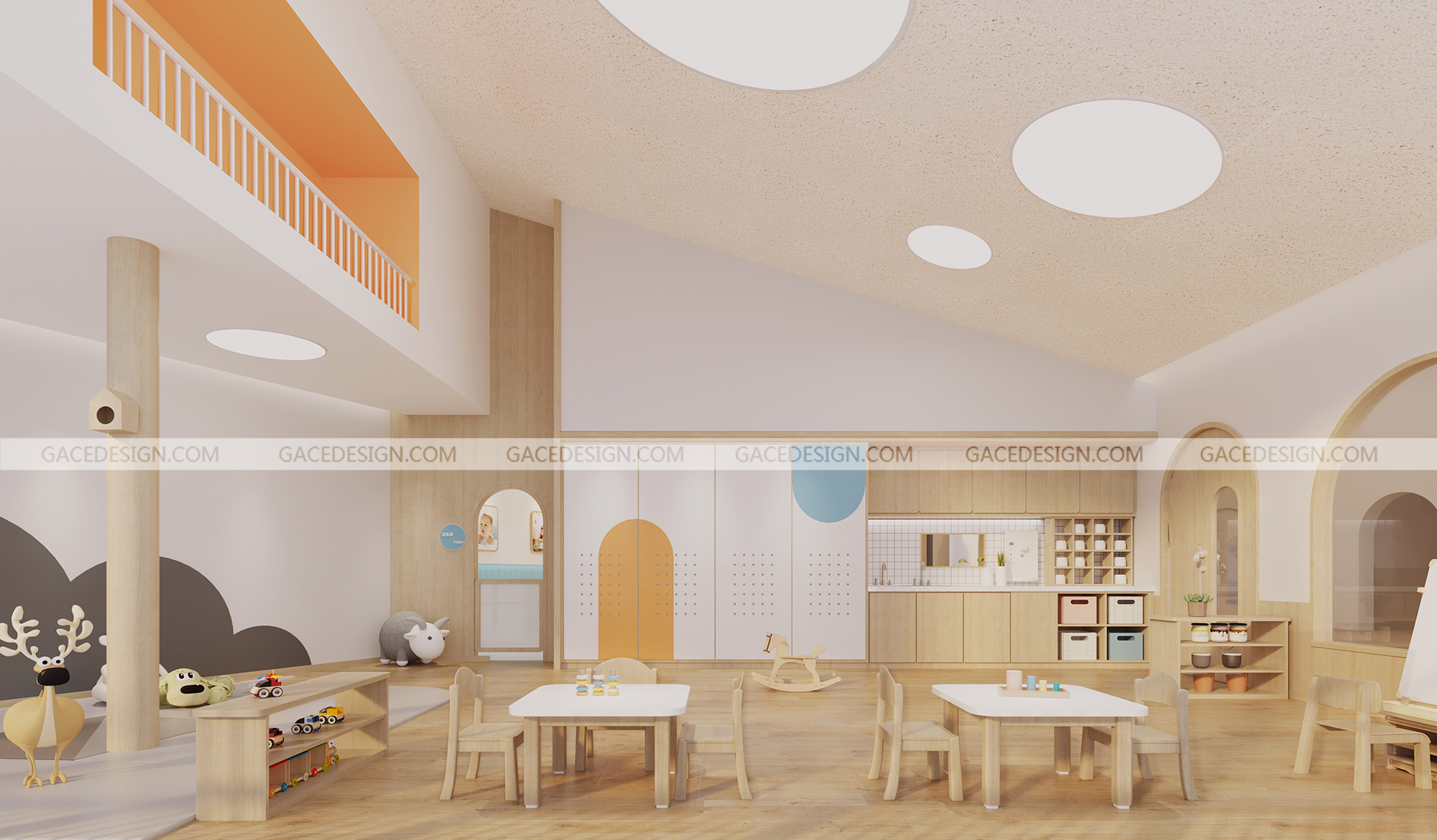 設(shè)計概括:作為浙江省臺州&嘉興市的第一批示范性且根據(jù)托育設(shè)置標(biāo)準(zhǔn)建設(shè)的盈利性高端托育園,總面積700&1000平。我們把設(shè)計重點(diǎn)放在了教育理念和兒童心理層面上??臻g中除了功能性,以滿足孩子們的日常食宿,需要更多的可拓展性。場地為純粹的室內(nèi)空間,而幼兒天性的釋放往往在戶外。如何將戶外元素與功能性結(jié)合,我們想到用建筑思維來解構(gòu)空間,讓空間立體而生動。結(jié)合陳鶴琴老先生的教育理念,我們在室內(nèi)設(shè)計了富有親和力、天然感的兒童探索洞穴和一條無邊界的跑道。
