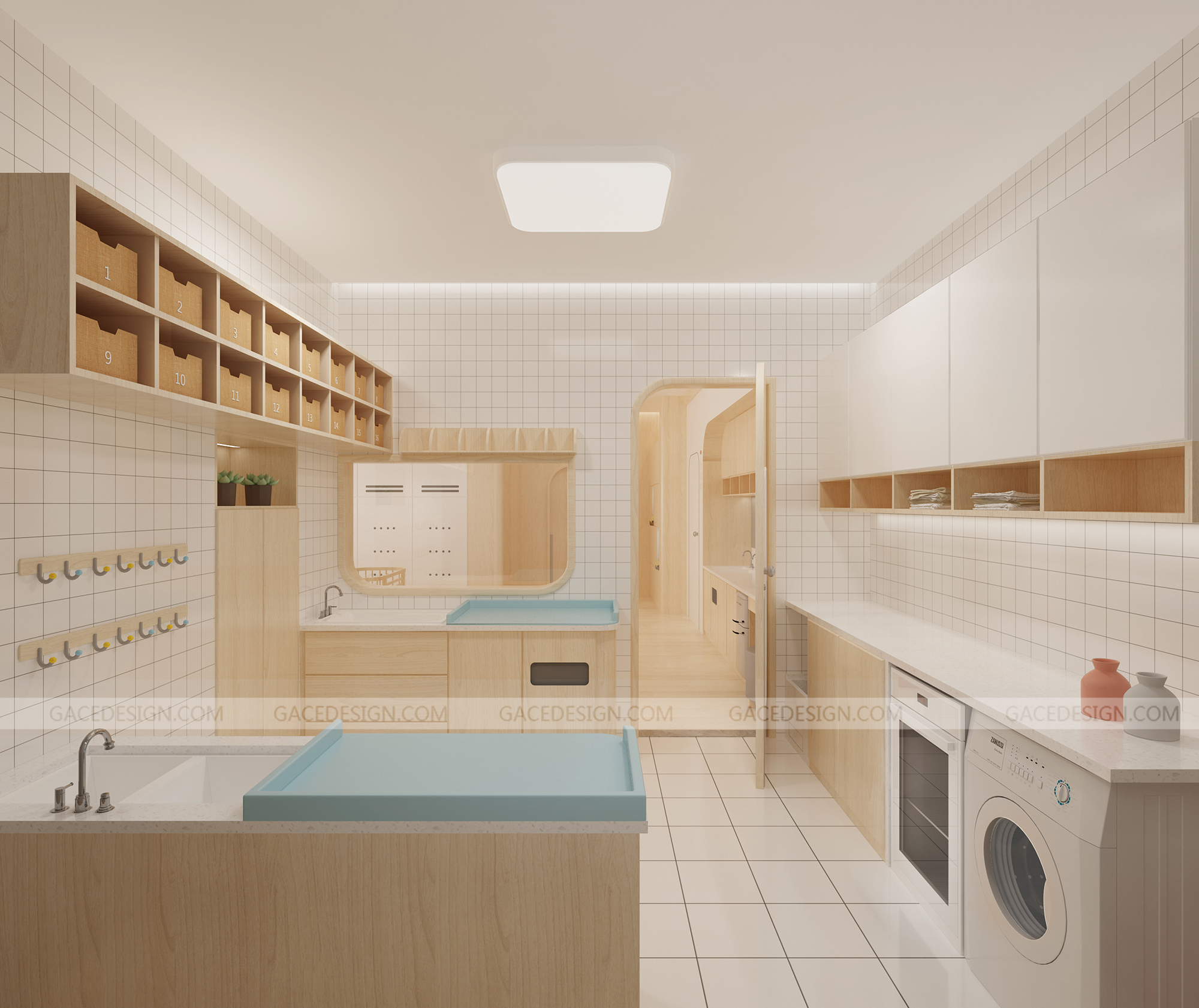 設(shè)計概括:這是我們幫啟思頓托育園設(shè)計的旗艦店,面積達到1000平以上,作為中山市高標準的示范性托育園,我們在設(shè)計之前組織設(shè)計師進行跟崗觀察,學習守護型嬰幼兒保育等系列保育書??紤]到保育員在操作層面上的便捷性,我們進行了場景模擬,把操作層面所涉及的柜體以及路徑進行了系統(tǒng)性整理。考慮到嬰幼兒在保育園的心理狀態(tài)以及發(fā)展心理學和空間敏感,我們定位這個項目是孩子的第二個家。是一家值得爸爸媽媽愿意托付的托育園。