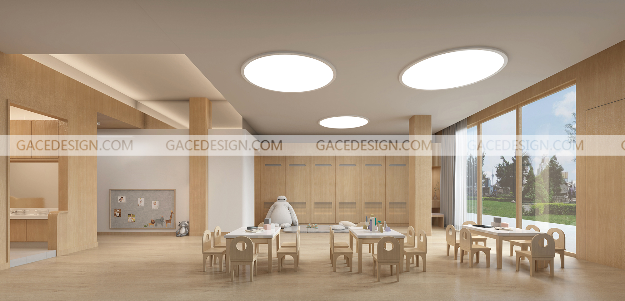 設計思考:首先擺在我們面前的是要解決通風和采光問題。作為家長對于空間的要求,除了安全以外,最在意的就是通風和采光。在室內(nèi)采用了兩種視角,即成人和小孩的視野,場地一共設計了4個托育班,1個科學育兒指導區(qū),其他均是配套功能等。讓成人亦可投入這個兒童空間,真正地塑造出能讓人安心的空間。新空間在視覺上更加開闊,前廳均有充足的自然光線,環(huán)境明亮且溫暖。從前廳過道到科學育兒指導區(qū),是一個眼前一亮的開放性空間。純凈的室內(nèi)空間讓孩子們擁有更多創(chuàng)造的空間。這里能提供街道和社區(qū)科學育兒指導站建設指導,為街道和社區(qū)指導站運作提供支持。所以該空間需要一定的活動面積,需要承載開展活動、爬行、感統(tǒng)區(qū),游樂繪本等互動性功能。我們試圖打破這種室內(nèi)外一刀切所帶來的生硬的邊界感,通過設計我們最大程度的把陽光帶給教室,讓教室形成豐富的多層次視野。配合明亮的落地窗,讓孩子的活動空間更加通透。