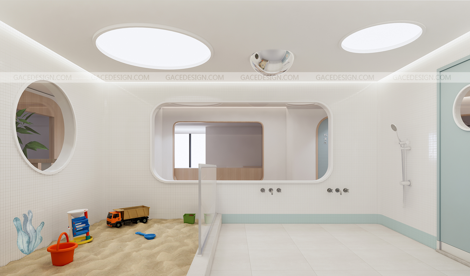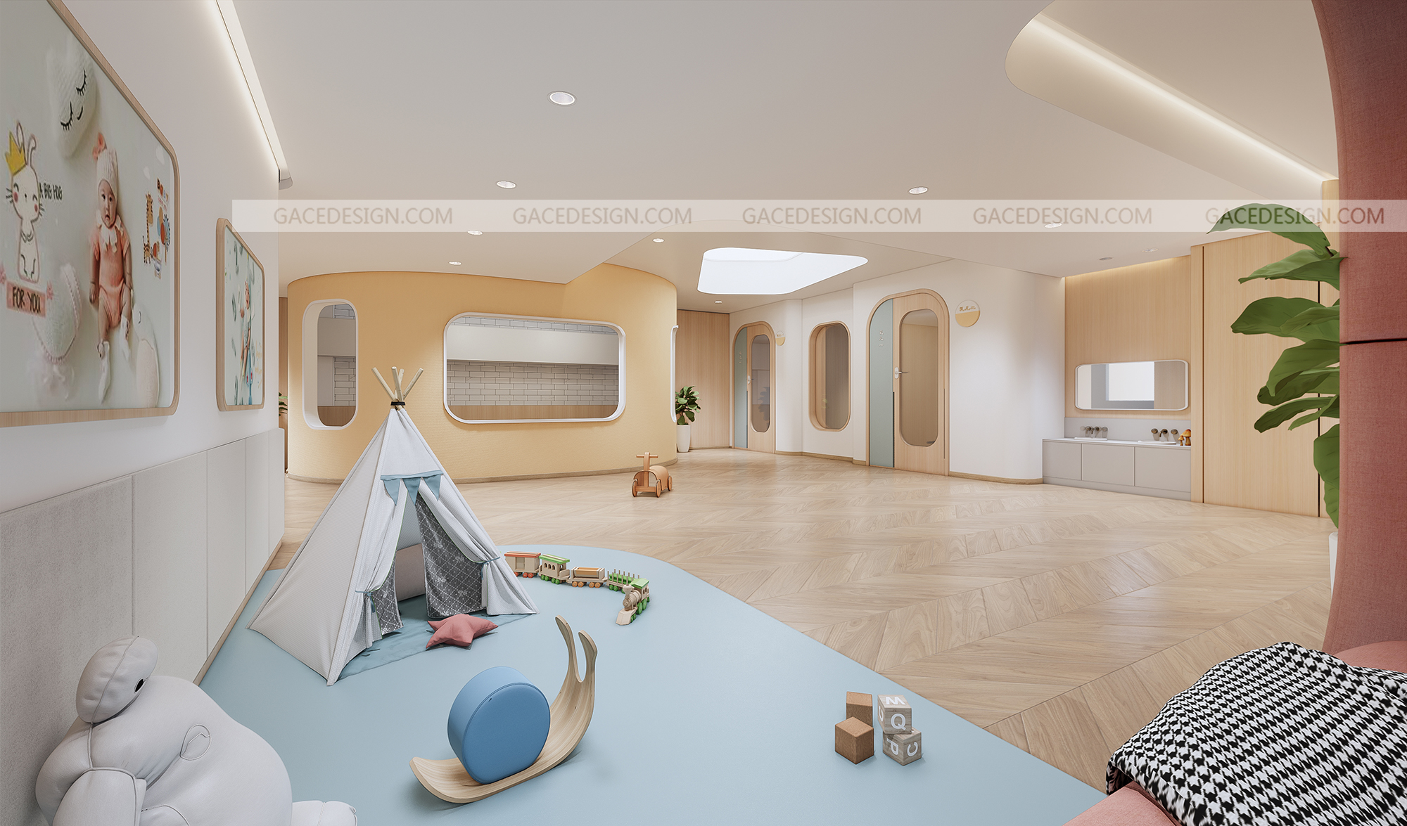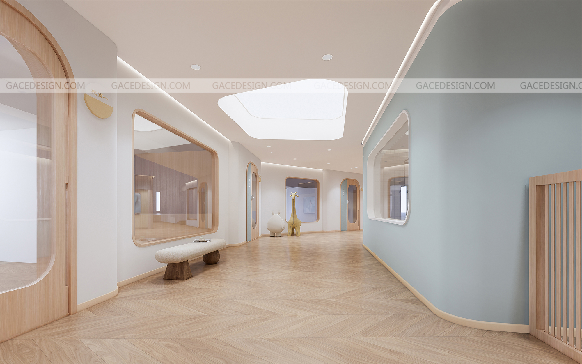 設計思路:通過有溫度感的設計,干凈的空間,但又能夠讓使用者有舒服的體驗,設計不是堆砌造型,應該讓使用者在里面待的狀態(tài)可以很放心,溫暖。通過空間里面的大小細節(jié),材質,燈光,人與人之間的眼神和交流而感到幸福。通過具備挑戰(zhàn)性的區(qū)域讓孩子們有各種情感上的變化。而且我們在室內設計了一個微縮園林,希望孩子可以與自然環(huán)境緊密相連。