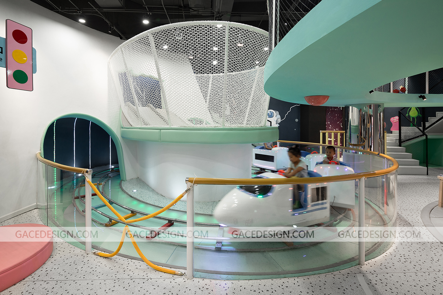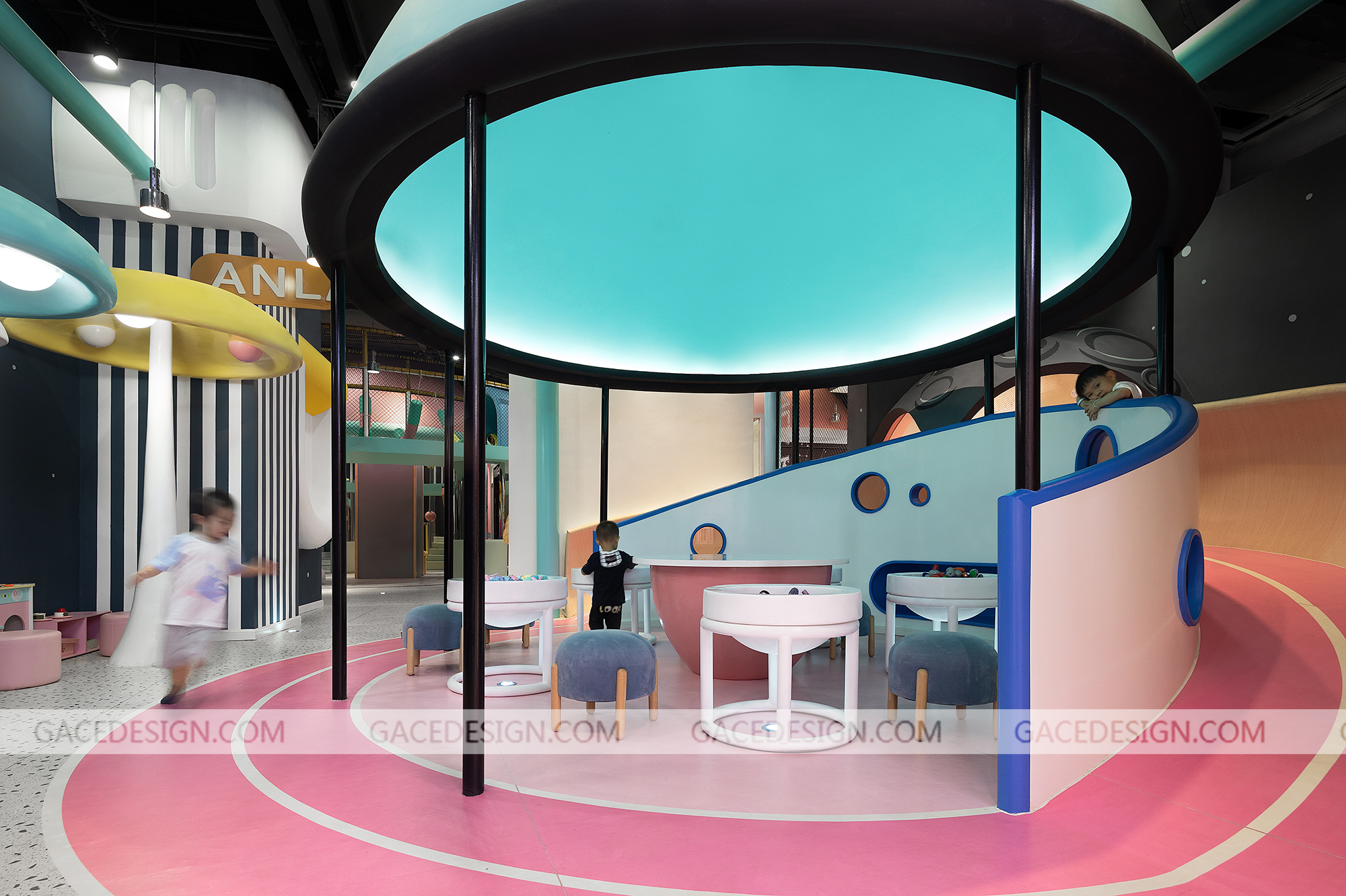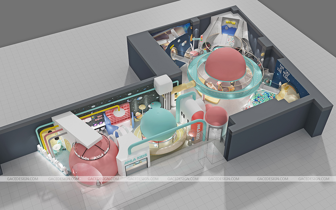 設(shè)計(jì)師將游樂場(chǎng)主題定為“未來(lái)星球”,以“未來(lái)”作為設(shè)計(jì)方向,以“星球”做為設(shè)計(jì)的核心。各種體量的“星球”在太空中穿行,打造出豐富多彩的星球世界。設(shè)計(jì)師根據(jù)孩子的冒險(xiǎn)精神設(shè)定多種游戲玩法和路線,孩子進(jìn)入游樂場(chǎng)后,首先需要了解故事背景,在置身其中不斷迎接挑戰(zhàn),最終完成“拯救家園”的任務(wù)。整個(gè)游樂場(chǎng)分為前端接待區(qū)、中端靜態(tài)游戲區(qū)、后端動(dòng)態(tài)游戲區(qū)。