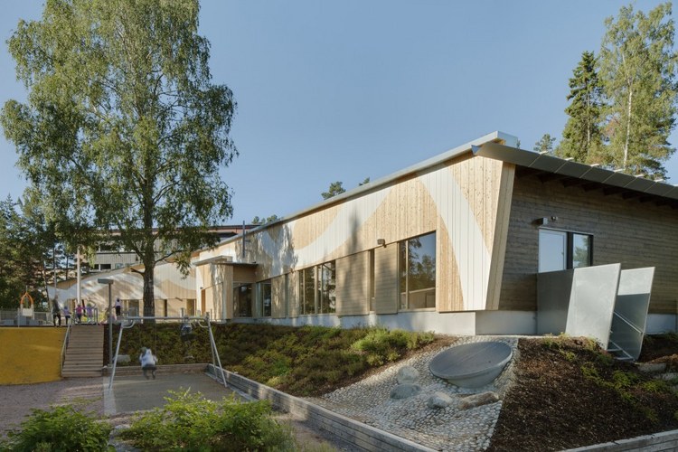 Omenapuisto日托中心位于芬蘭赫爾辛基,整個建筑主要的由單層體量構(gòu)成,兩層高的部分是一個多功能的高挑空......
