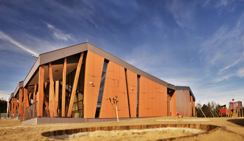 這兩棟建筑坐落于一個自然的斜坡之上。南邊的樓是學(xué)前班和托兒所,北面的樓也用于托兒所。建筑主入口位于ru......