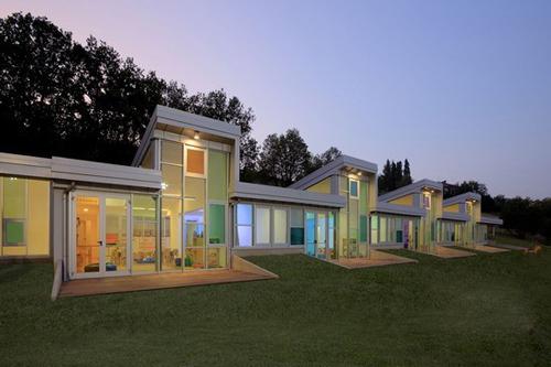 寬大的玻璃窗系統(tǒng)在一天中的不同時候都可以對太陽光線進(jìn)行過濾,以保持住室內(nèi)的熱量。其它的熱源通過兩個不同的設(shè)備來獲得:放置在防水壁裝置中的地?zé)崽筋^和位于地面和熱泵間的熱交換設(shè)備。光電池辦被安裝在屋頂隔間中。雨水被收集進(jìn)特別的水槽之中,用于灌溉和沖洗浴室。顏色,材料和特別的設(shè)計形狀體現(xiàn)出了所有可持續(xù)性的系統(tǒng),它們同時也體現(xiàn)出了整個建筑的現(xiàn)代感。