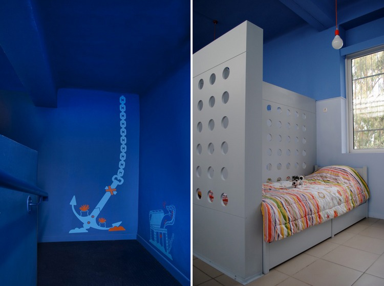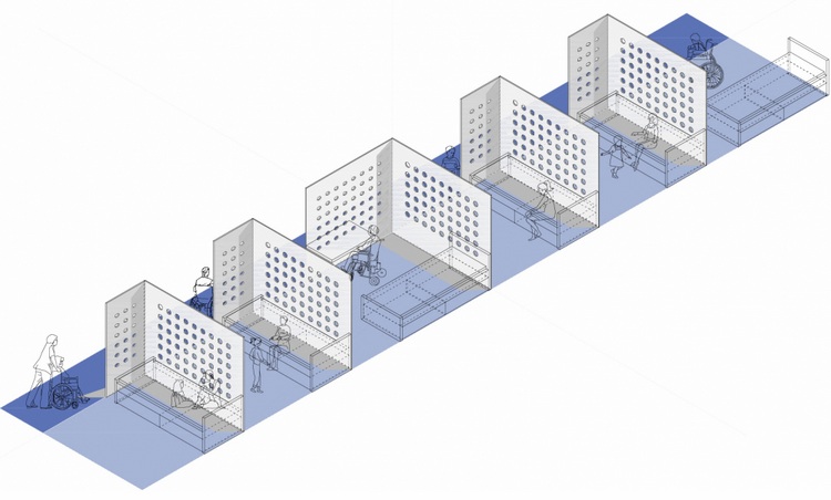 睡眠空間包含兩部分,一是隱藏空間,一是“凹處”。“隱匿處”的穿孔木制面板創(chuàng)造了獨(dú)立而且光學(xué)連續(xù)性良好的房間,而在“凹處”靠床一面的墻壁則被加厚,床深深嵌入環(huán)繞它的墻壁里,保證了在公共房間內(nèi)的隱私。