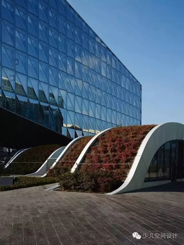 建筑所采用的常規(guī)結(jié)構(gòu)及其交替起伏的形態(tài)在基地滿鋪,屋面被植株所覆蓋。這種手法在起伏的凸起部分形成遮蔽空間,凹面下則為室內(nèi)活動(dòng)區(qū)域。Origami 幼兒園的特殊性質(zhì)源于這種重復(fù)的幾何規(guī)律形態(tài),設(shè)計(jì)師運(yùn)用了多種材料:金屬的窗戶豎框、橫梁與木材等。