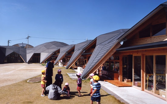 maihara幼兒園它位于日本滋賀縣,它的周邊都是一些新建的住宅區(qū)?;炷恋暮凶佑蛇B續(xù)的木頭屋頂鏈接為一體,屋頂用連續(xù)的三角形的平面構(gòu)成;它的結(jié)構(gòu)的強(qiáng)度和形狀的連續(xù)性有很大的自由度。屋頂使用2.5米長的木梁和六角形的金屬(接頭)配件,工廠預(yù)制,現(xiàn)場裝配。木制桁架和混凝土盒子組合出各種各樣的結(jié)構(gòu)表現(xiàn)效果。