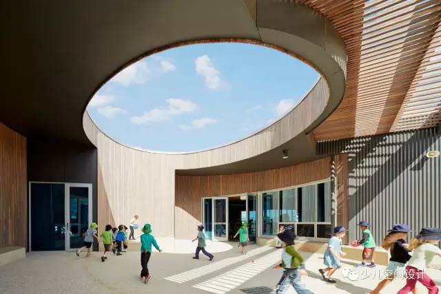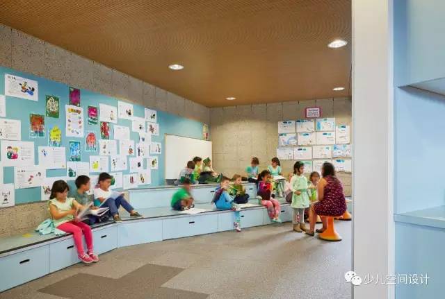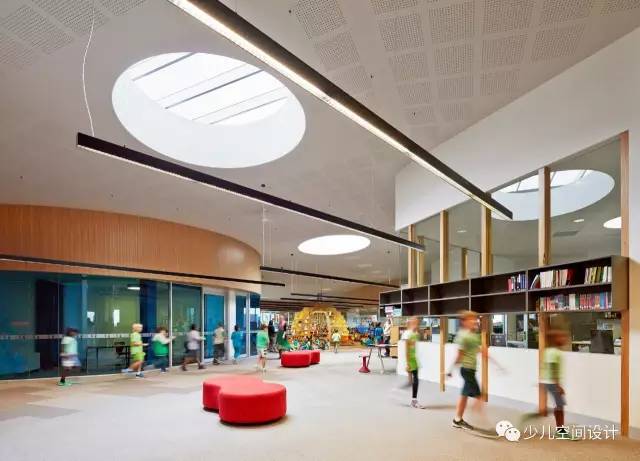 由于材質(zhì)面板呼應(yīng)色彩鮮亮的學(xué)生作品和家具,學(xué)校顯得熱情好客和溫暖;深色調(diào)與寬闊的玻璃相結(jié)合,增強(qiáng)了設(shè)施的透明度。大量插件板用于墻壁、地板和天花板,在廣泛的聲學(xué)處理中發(fā)揮關(guān)鍵作用,這是混合學(xué)習(xí)空間里必不可少的。(幼兒園設(shè)計)