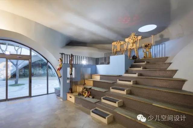 第一棟樓(波浪與鯨魚(yú))試圖表達(dá)一種受匹諾曹故事啟發(fā)的空間,大風(fēng)暴和鯨魚(yú)等主題都進(jìn)行了表現(xiàn)。平面布局采用了曲線,讓人想到子宮內(nèi)蜷曲的胎兒。平面之后演變成了鯨魚(yú)與波浪的結(jié)合,最終融為一體。大臺(tái)階與小臺(tái)階營(yíng)造的座椅間營(yíng)造的狹長(zhǎng)扭曲空間試圖增強(qiáng)空間的游戲性與冒險(xiǎn)感。不幸的是,這里暫時(shí)關(guān)閉。被建筑圍合起來(lái)的不封頂?shù)陌伎訝羁臻g在天氣好時(shí)可以作為室內(nèi)空間的延伸。由于所有的窗戶可以折疊和推到兩側(cè),許多室內(nèi)的概念與設(shè)計(jì)都可以被盡可能地實(shí)現(xiàn),但是出于內(nèi)容與安全考慮只有中間區(qū)域可以安置這樣的內(nèi)容。