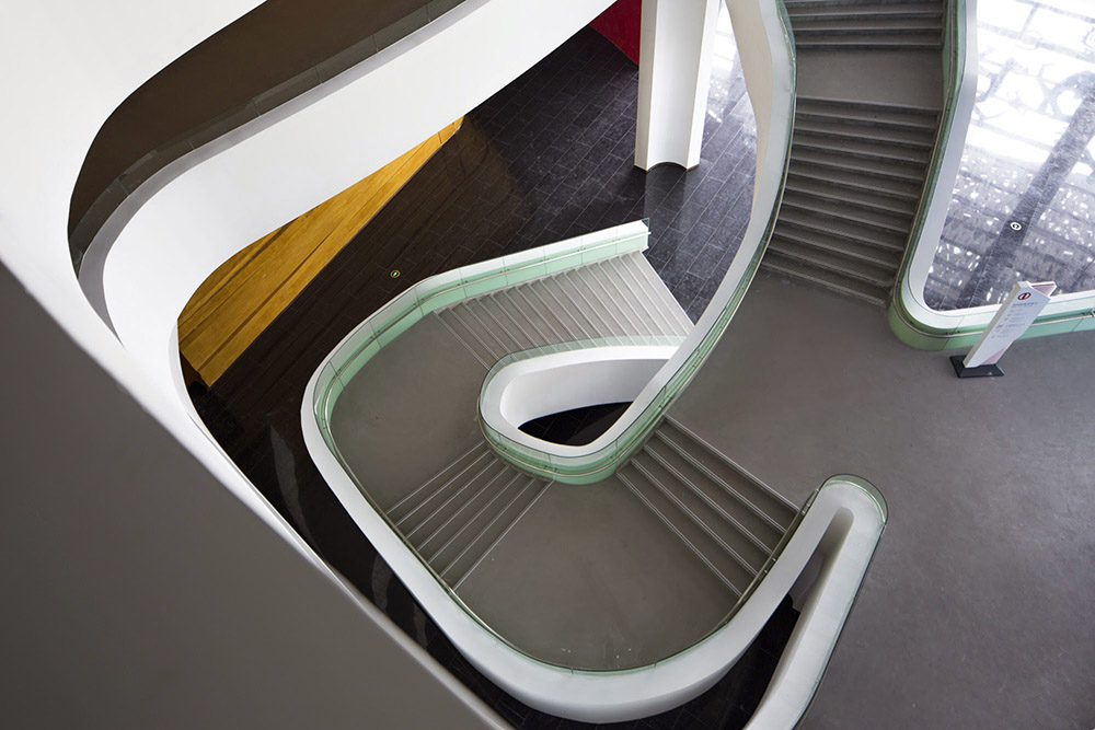文化中心的所有樓層被大型休息廳連為一體,休息廳以藍(lán)色與紅色的墻壁與中國戲劇臉譜圖像歡迎到訪的客人。不同樓層之間用白色帶狀造型的走道連接。整體建筑中金屬制造的,由數(shù)以萬計的獨立鋁片組成流線型屋頂尤為突出。(幼兒園室內(nèi)設(shè)計)