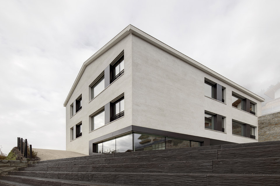 就像這些山區(qū)的民居建筑一樣,他們也把自己的體重靠在山坡上.。這兩個主體結(jié)構(gòu)的位置是由多功能廳連接的,它也為公眾服務(wù).。學(xué)校周圍的慷慨開放的空間,作為兒童游樂場和運動區(qū)。此外,這些空間成為一個露天舞臺,通過額外的元素,最受青睞的性格一般可用的會議afers鎮(zhèn)的地方。顏色和材料的概念正在執(zhí)行減少的外觀,關(guān)于建筑物的大小和體積。它強(qiáng)調(diào)和諧融入村莊周圍。白色粉刷外墻,其結(jié)構(gòu)一直保持粗糙,給直接對比黑暗的電化鋁窗框。