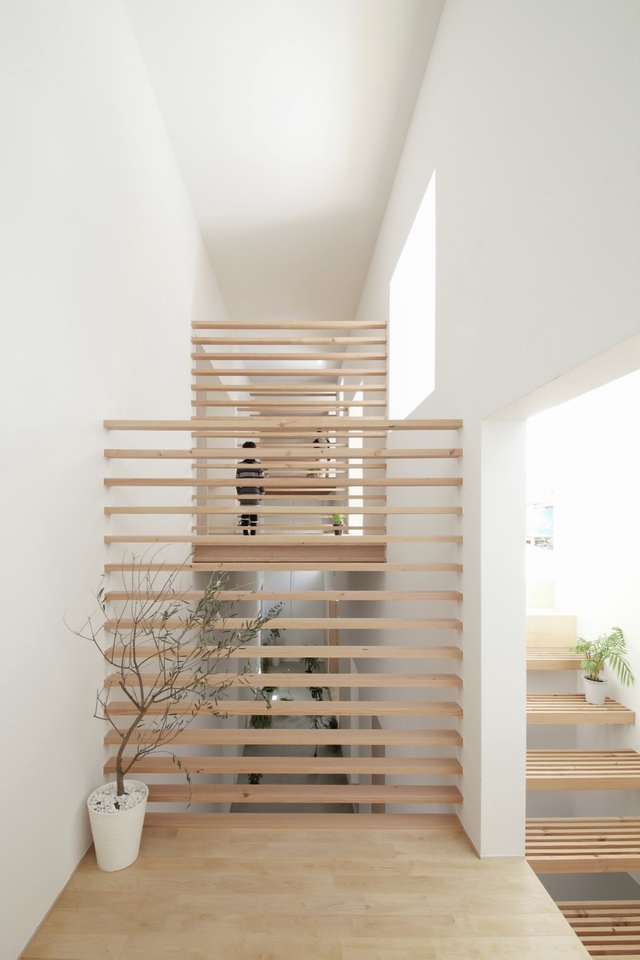 于是設計師就有了一個反L的建筑方案,而陽光收集器就是搞起來的那一部分,通過建筑頂部的天窗和方窗把陽光大口的吞噬到了室內(nèi),在室內(nèi)的陽光收集器也作為樓梯,在第二層部分設計了幾間臥室,為了能讓陽光更加有效的投到首層,樓梯采取了格柵的形制,這樣使得陽光的光想盡可能的漏下去。