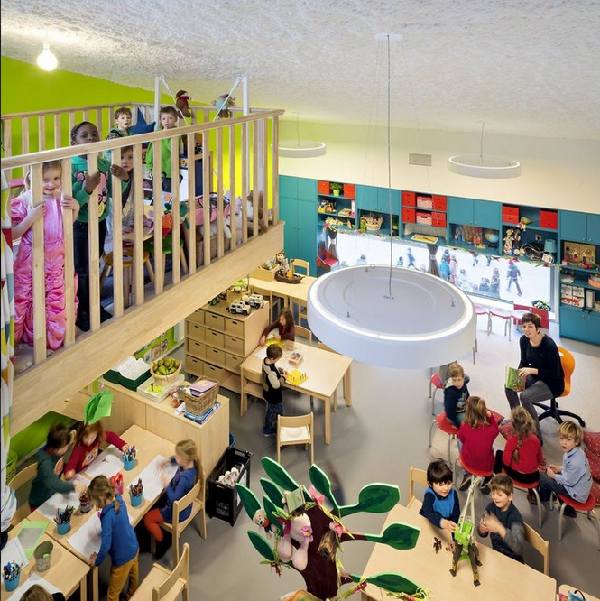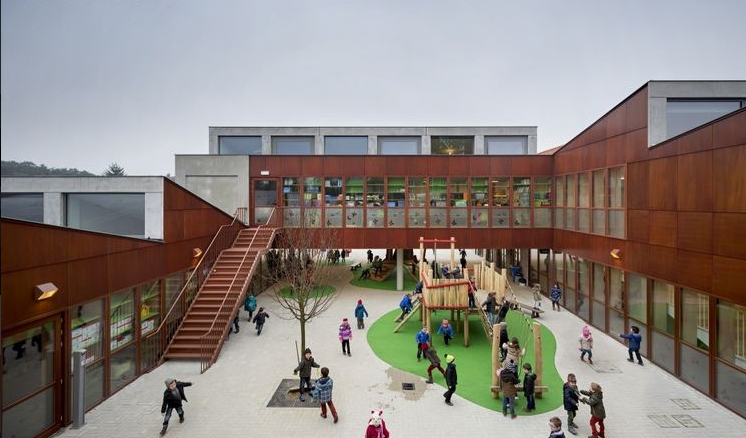 在老建筑和新學校建筑通過一個“回廊”相連。這個“回廊”位于院子周圍,提供通道可以進入所有房間。這個院子容納了操場。小學建筑也被保留。新老建筑結(jié)合的結(jié)果形成了令人興奮的安全的環(huán)境,適于小孩玩耍和學習。(幼兒園室內(nèi)設計)