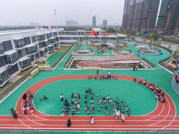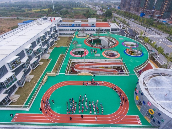 在浙江湖州長(zhǎng)興縣龍山街道的中心幼兒園,在十月十七日正式開(kāi)園,這是一個(gè)投資八千萬(wàn)元占地十九畝的幼兒園,據(jù)了解這個(gè)幼兒園的設(shè)計(jì)理念是來(lái)源于日本,在日本富士有個(gè)幼兒園和空山中心幼兒園一樣都是在郊外建設(shè)的,因?yàn)橥恋赜邢薜菍W(xué)生們還是需要一個(gè)可以給學(xué)生運(yùn)動(dòng)的的操場(chǎng),為了解決這個(gè)場(chǎng)地不足的問(wèn)題所以設(shè)計(jì)師還講操場(chǎng)跑到設(shè)計(jì)到了屋頂,做成了一個(gè)環(huán)形結(jié)構(gòu),之所以要這樣設(shè)計(jì)是因?yàn)楹⒆拥倪\(yùn)動(dòng)規(guī)律是特別喜歡跑圈。