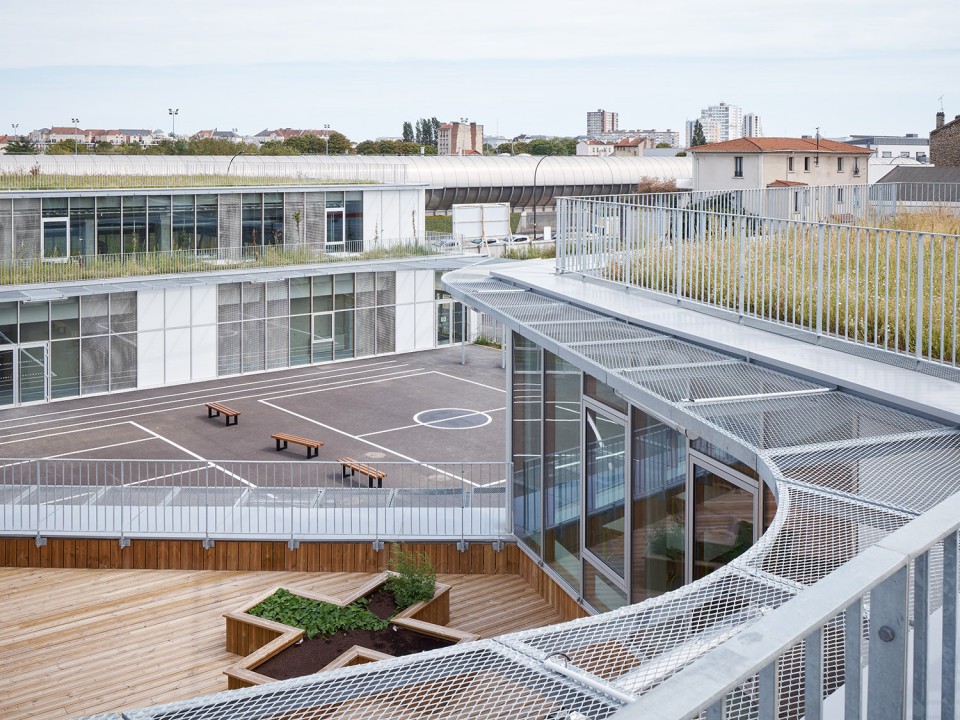 學(xué)生宿舍的設(shè)計(jì)基于4個(gè)主要建筑學(xué)原則。首先,項(xiàng)目作為一個(gè)整體要具有合理的功能(結(jié)構(gòu)和技術(shù)空間的疊加),同時(shí)還要緊湊。距離其他功能分區(qū)的距離使它有所脫節(jié),具有一定的獨(dú)立性。由于宿舍區(qū)被設(shè)置在盡可能北的方位,最窄的立面朝向Jean-Jaurès大街,平臺(tái)不會(huì)阻擋陽光進(jìn)入室內(nèi)。這也保證了操場能夠享受足夠多的陽光。