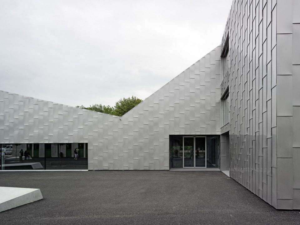 整個(gè)建筑的山墻朝向南北,與城市肌理相契合。承重墻、樓板與立面組成承重系統(tǒng)以鋼筋混凝土構(gòu)筑而成,以求達(dá)到當(dāng)?shù)叵嚓P(guān)部門(mén)對(duì)抗震的要求。屋頂結(jié)構(gòu)的兩重結(jié)構(gòu)皆有木材制成,而外層則覆蓋著金屬薄片,而類似的,建筑的立面也由魚(yú)鱗般的金屬般構(gòu)成。遠(yuǎn)遠(yuǎn)看去,建筑仿佛呼應(yīng)著周?chē)娜荷?,錯(cuò)落起伏。相互穿插的方形體量組合出疏密有致的空間,而高低起伏的屋頂從東向西延伸。新建的學(xué)?;顒?dòng)中心延續(xù)了校園現(xiàn)有的空間秩序,同時(shí)也與周邊的傳統(tǒng)建筑形式遙相呼應(yīng)。