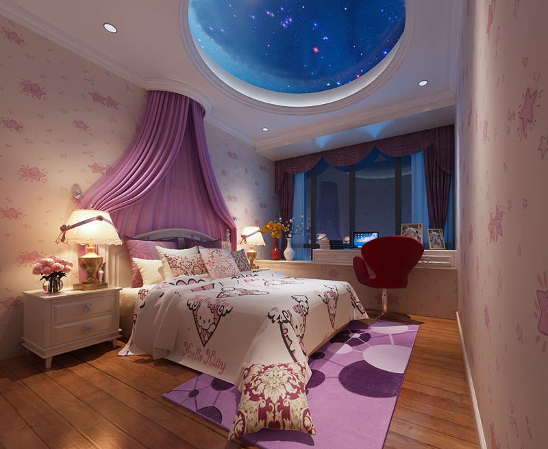 第二公主風:每個女孩子都有著一個公主夢,一個大大的窗口,室內有著一張柔軟舒適的大床,在小的時候可以在室內放置一些卡通風格的公仔長大之后可以換成簡約大氣的風格,而室內以粉色裝飾四周加上天花板上裝飾這一個“星空”對任何一個女孩子來說都有著一種致命的吸引力。(幼兒園設計)
