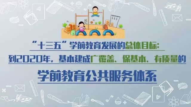 《意見》對“十三五”學前教育改革發(fā)展做出了全面部署,提出了“十三五”學前教育發(fā)展的總體目標:到2020年,基本建成廣覆蓋、保基本、有質(zhì)量的學前教育公共服務體系。