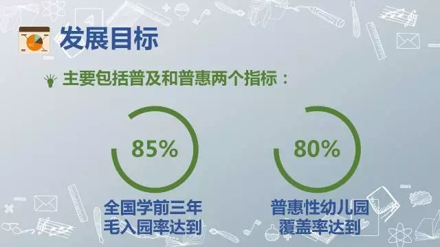 主要包括普及和普惠兩個指標:全國學前三年毛入園率達到85%、普惠性幼兒園覆蓋率(公辦幼兒園和普惠性民辦幼兒園在園幼兒數(shù)占在園幼兒總數(shù)的比例)達到80%左右,這是落實“十三五”規(guī)劃,實現(xiàn)學前教育基本普及、解決“入園難”“入園貴”的關(guān)鍵指標。
