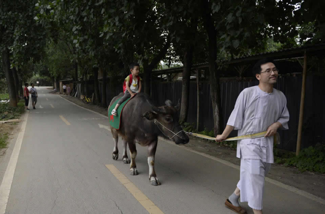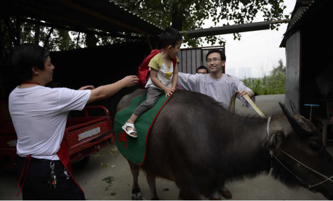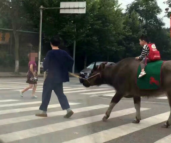 父親醉心國學(xué),帶3歲兒子騎上黑色大牛去上學(xué)