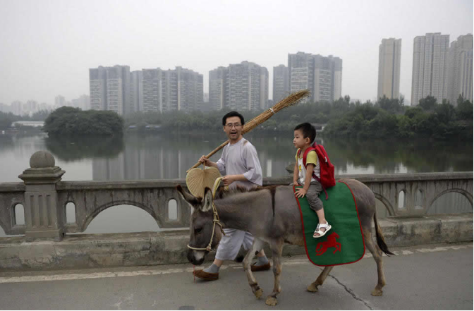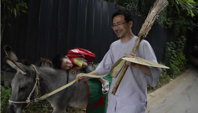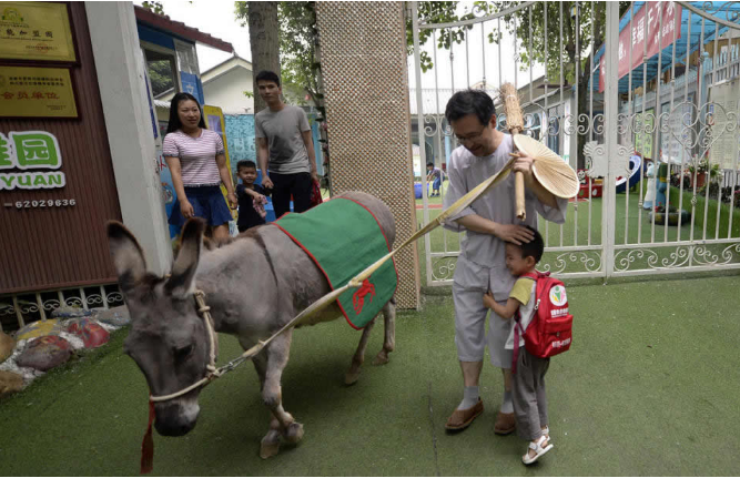 李里牽驢到幼兒園門口接孩子,路上教孩子背《三字經(jīng)》、《劍門道中遇微雨》