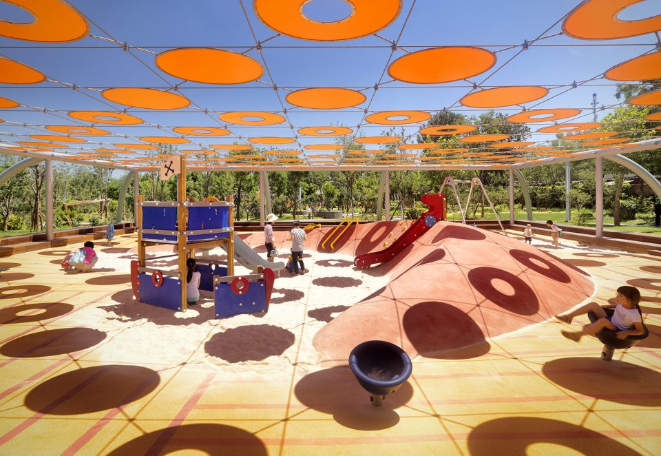 第一個(gè)游樂(lè)場(chǎng)是一個(gè)與景觀完美相融合的正方形區(qū)域。這個(gè)場(chǎng)地由木制長(zhǎng)椅圍合成一個(gè)微微下沉的地塊空間。這種為家長(zhǎng)提供的休憩空間也劃定了場(chǎng)地的界限,為孩子們創(chuàng)造了一個(gè)安全的游戲區(qū),讓他們可以盡情地玩耍。為了進(jìn)一步增強(qiáng)圍合感和保護(hù)感,橙色圓盤(pán)構(gòu)成的天蓬懸浮在人們的頭頂上。這些圓盤(pán)在柔軟的游樂(lè)面上投射了一層棋盤(pán)狀的陰影,為孩子們遮擋陽(yáng)光,驅(qū)逐炎熱。
