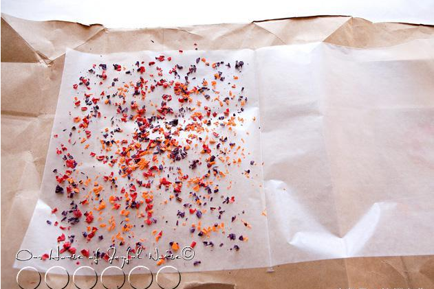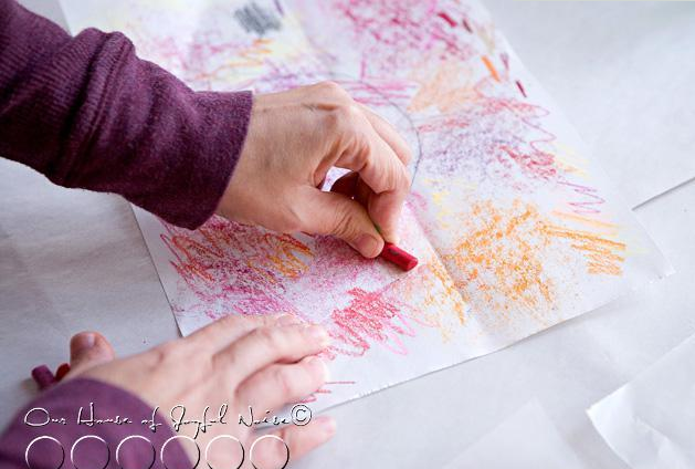 將牛皮紙鋪在蠟紙下面,削蠟筆屑
