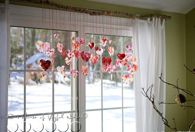 用絲帶將心形圖案串起來,調(diào)整不同的長度,裝飾教室