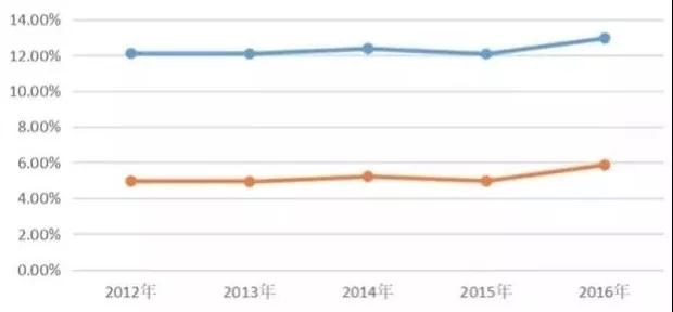 上述圖表是2012年-2016年中國(guó)人口出生率和自然增長(zhǎng)率概況。出生率在2014年曾出現(xiàn)小幅上漲達(dá)到12.37‰,2016年漲幅較大達(dá)到12.95‰,其余時(shí)間無(wú)明顯變化,均維持在約為12‰的水平。