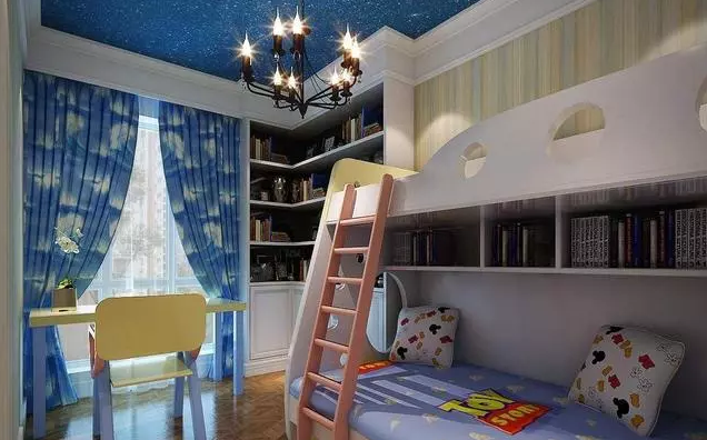 首先我們對屋內(nèi)的色彩選用要恰當,如果是男孩子的話,我們可以盡量多選一些藍色、綠色和黃色這樣的鮮艷色彩,當然也可以添加一些黑色和白色。如果是女孩子的話,就可以多選擇粉色、黃色和粉色這樣的色彩。孩子們對色彩很是敏感,像天花板、地面、墻面、窗簾、床罩等我們都可以選擇一些明亮的色彩,或者直接用一些鮮艷的飾品來裝飾墻面。