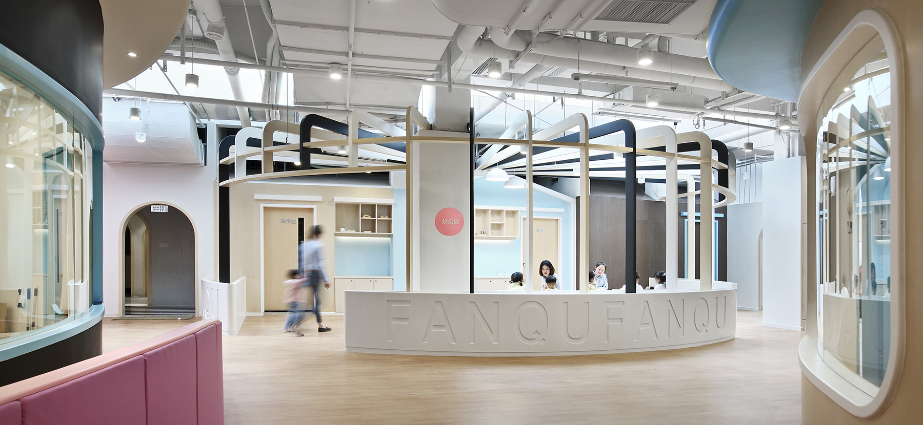 設(shè)計(jì)師延伸“番趣”的品牌形象,打造項(xiàng)目主入口外觀,品牌元素與園區(qū)的展示需求相融合,構(gòu)成明凈活潑的外觀形象。門(mén)頭和前臺(tái)造型取自品牌“F”元素,以親切的姿勢(shì)歡迎小朋友和家長(zhǎng)的到來(lái)。