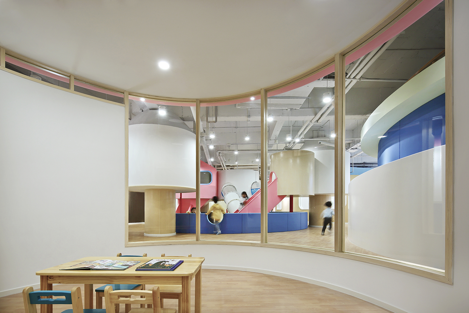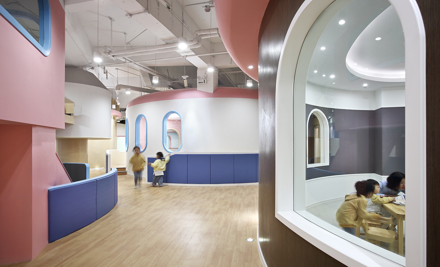 游戲是孩子的活力之源,也是孩子通往世界的途徑。設(shè)計(jì)師將游樂(lè)區(qū)布局在室內(nèi)的中心位置,讓孩子的歡聲笑語(yǔ)激活整座“城”。孩子們會(huì)帶著好奇和期待爬上梯子,穿過(guò)可愛(ài)的小木屋,在管道中匍匐前進(jìn),然后“咻”地一下滑入下沉的球池,在不斷變化動(dòng)作和愉悅的體驗(yàn)中獲得身心的鍛煉和能力的發(fā)展。