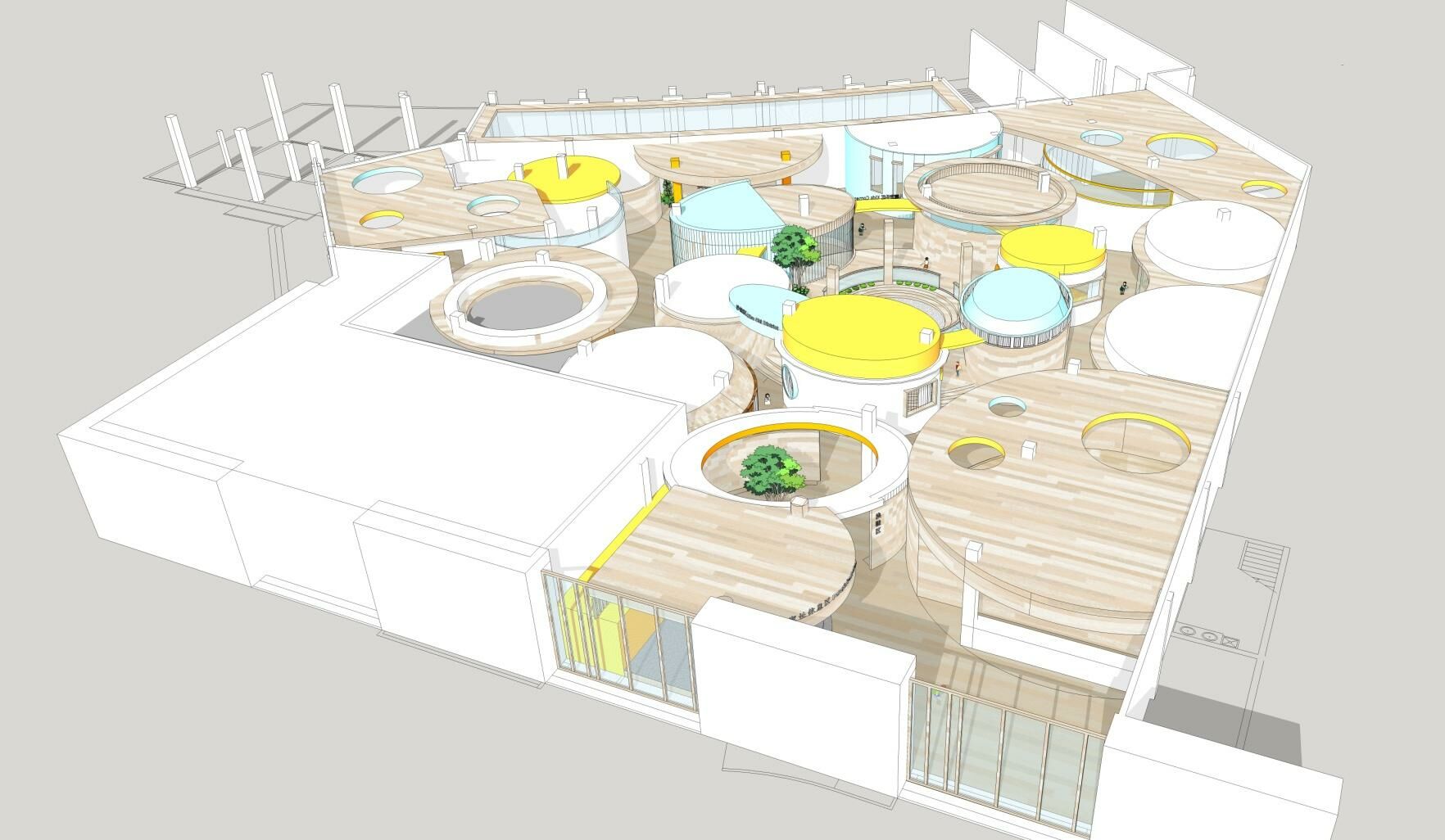 場(chǎng)地總面積有2000㎡,充分的條件讓我們能夠?qū)ⅰ俺鞘薪ㄖ边@個(gè)宏觀的概念和很多設(shè)想落地。如果將番趣兒童成長(zhǎng)中心看作一座城,我們?cè)撛鯓尤ゴ罱ǔ鞘校?/span>