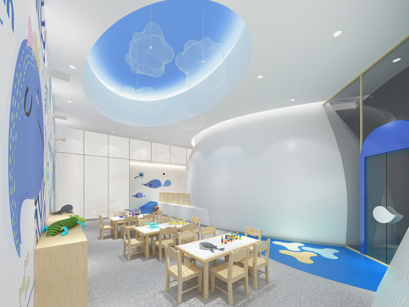 因此寓教于樂是非常重要的,讓小孩在享受完的樂趣的同時(shí)學(xué)到東西。我們應(yīng)當(dāng)創(chuàng)造這樣一個(gè)空間:幼兒園設(shè)計(jì)隨著孩子年齡的增長,他對空間的理解會(huì)產(chǎn)生變化我想很重要的一點(diǎn)應(yīng)該是吸引孩子,但同時(shí)又要讓她能把注意力集中在應(yīng)當(dāng)做的事情上。我們希望室內(nèi)的空間和自然能夠產(chǎn)生一些關(guān)聯(lián),具有一些戶外的特征。