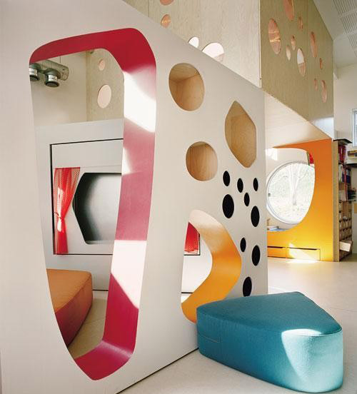 這些洞口可以被開發(fā)成多種用途———書架,抽屜,公仔盒;稍大的洞口還可以允許孩子們窩在里面擁有一個獨立的玩??臻g,為捉迷藏提供了絕好的空間;有的洞口設(shè)計了小小的窗簾,限定了空間,成為一個“成人勿入”的地方,也是玩“過家家”的絕佳場所。較高的墻安裝了攀援設(shè)施,在保證安全的前提下允許孩子們攀爬;較厚的墻內(nèi)設(shè)計了可容納孩子躺臥的微型小床,成為一個很有安全感的小臥室,超小的尺度使得成人只能“偷窺”,無法進入