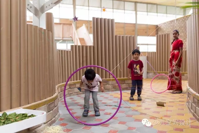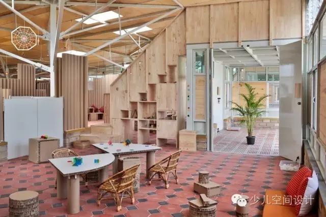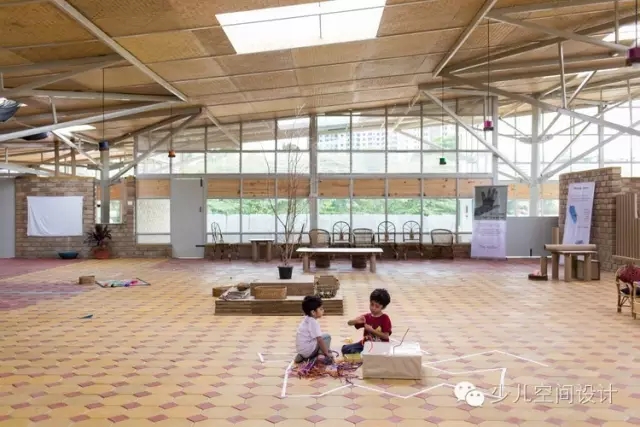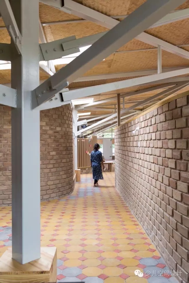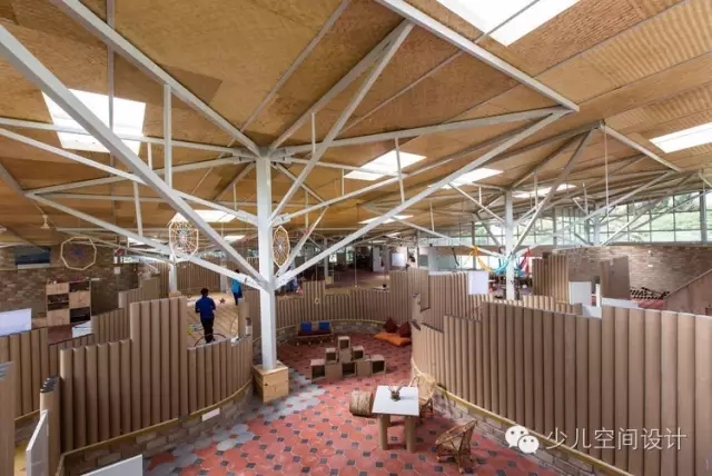 通過滲透性的室內(nèi)設(shè)計(jì),鼓勵(lì)了孩子們的探索學(xué)習(xí)——不同高度的墻體圍合了懸挑的教室和公共空間,其上是穿孔的天窗。屋頂收到8根柱子的支撐,每一個(gè)形式都是樹枝分叉。這個(gè)樹的形式,在形成結(jié)構(gòu)元素的同時(shí),讓屋頂?shù)母叨饶軌蚋鼮楹⒆觽兯兄??!皹洹毕碌目臻g同時(shí)重新詮釋了學(xué)習(xí)的區(qū)域,這樣的場(chǎng)景在郊外隨處可見。